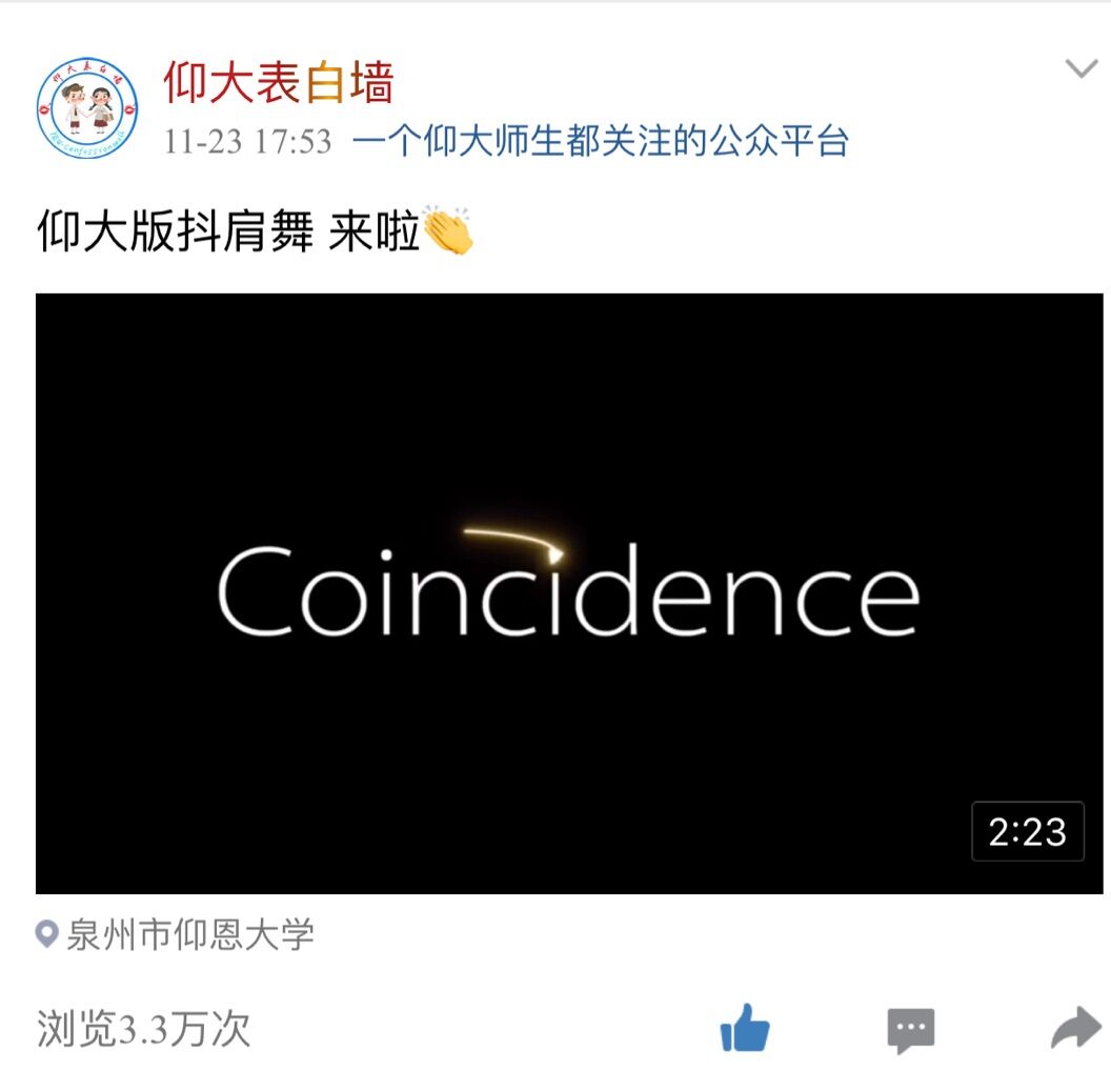 开云kaiyun官方网站17级英语2班的学生们于11月23日下午五点在“仰大表白墙”QQ自媒体平台上传了“Coincidence”抖肩舞趣味视频。该视频在QQ平台上获得3.3万次浏览量,1441个赞、732条转发及数条评论,引起学校广泛关注。