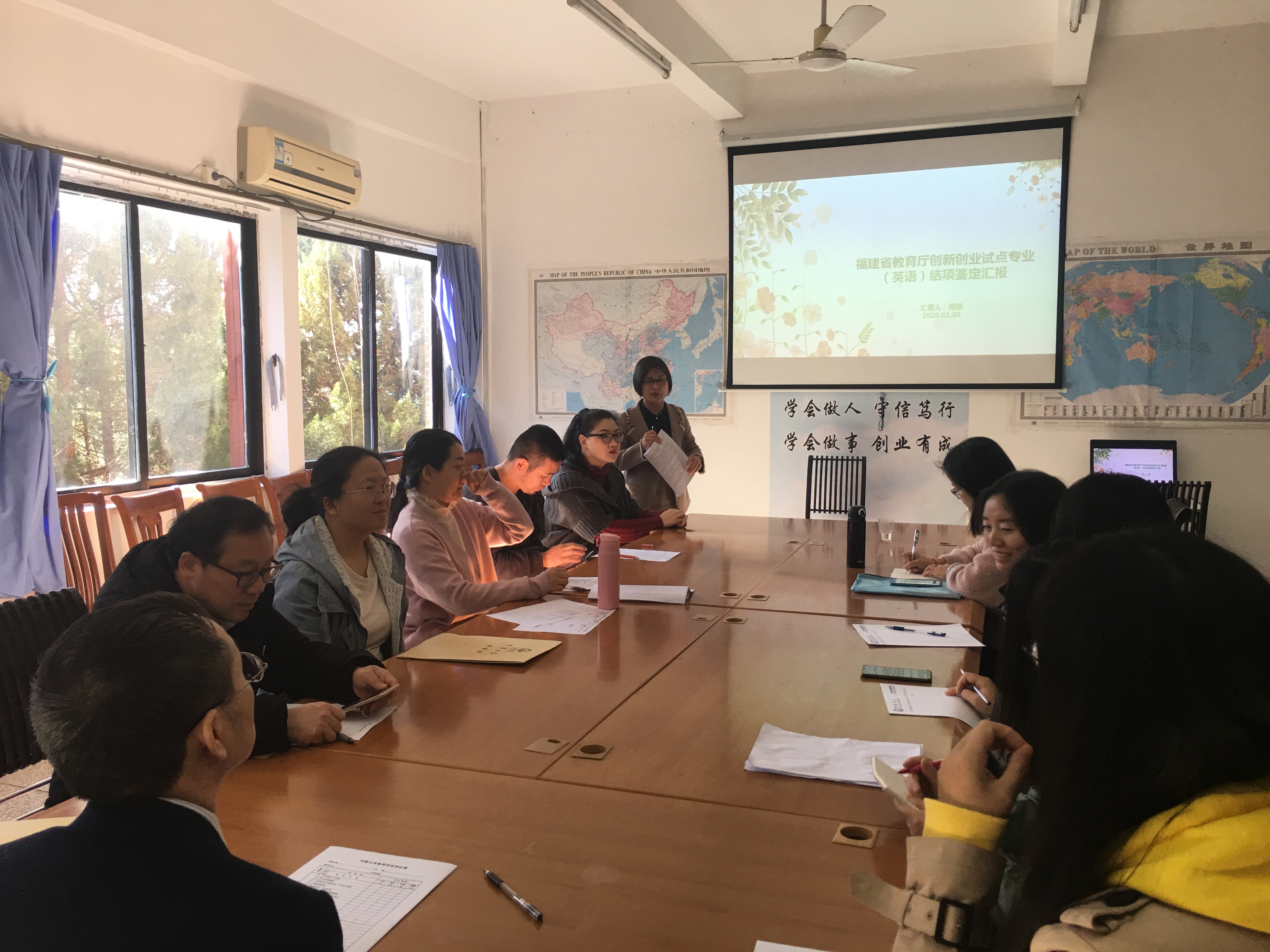 2019年1月8日,根据《福建省教育厅关于开展高等学校创新创业教育改革项目结项工作的通知》(闽教办高〔2018〕7 号)文件精神和学校科研部的工作部署,我院在仰光楼203举行福建省教育厅创新创业试点专业(英语)结项鉴定会。