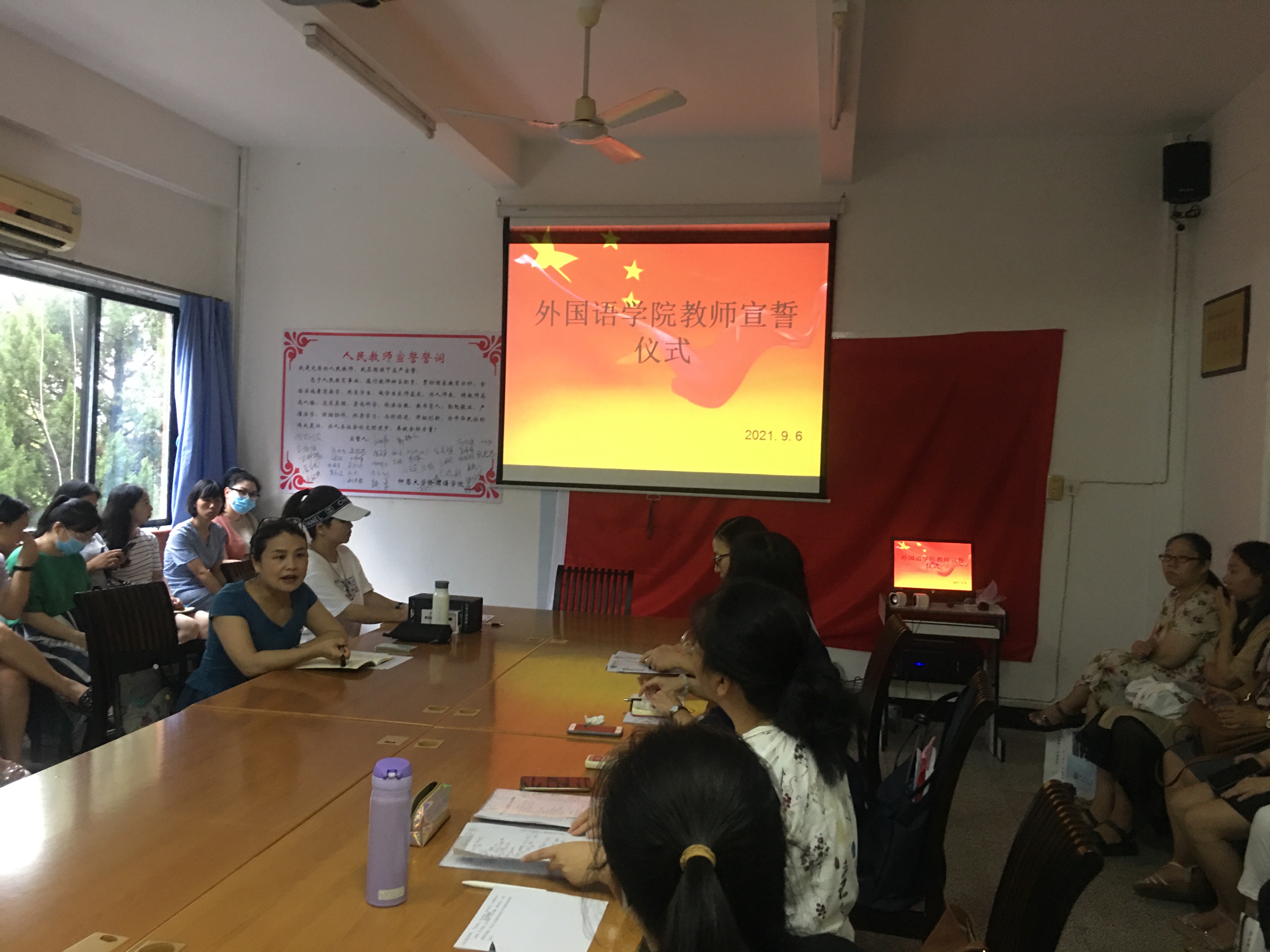 教师宣誓 学院的教学工作部署从学习许总校长教学工作会议上的讲话展开。林燕媚副院长传达讲话精神,希望大家能结合学校十四五规划查找自身问题及短板,在课程思政、专业建设、学科建设、实践教学、教学竞赛等方面以成果为导向,积极开展研究和实践,为学院乃至学校的发展添砖加瓦。胡娟院长以学院当下短板为切入点,引导老师们从课程思政着手,进行优秀教学案例采写、教研通讯投稿、开展示范课堂、申请省级课程思政项目,一步一个脚印,落实每一个环节。 同时,她也指出,教师们在面对困难时应转变思维,化被动为主动,有序高效开展教学创新和服务学生等工作,在新学期取得更好的成绩!