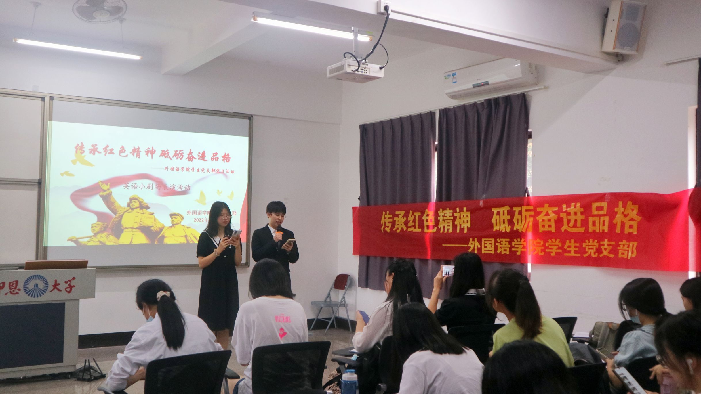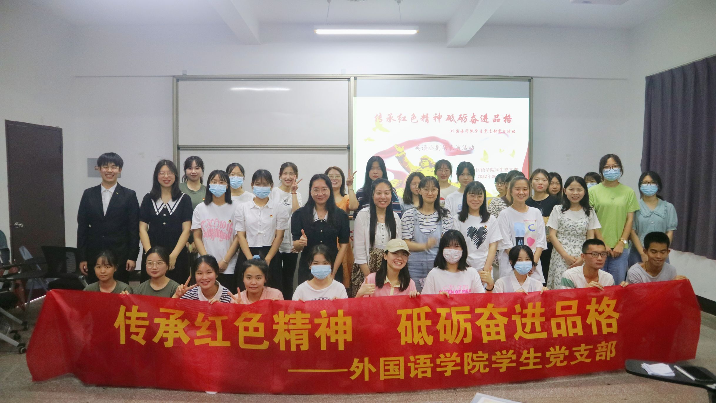 2022年6月15日下午开云kaiyun官方网站学生党支部在普照教学楼205教室开展 “传承红色精神,砥砺奋进品格”主题党日活动。本次主题党日活动包含两个主要部分:“传承红色文化,弘扬红色精神”主题英语小剧场表演活动和“红色盲盒,传承红色基因”活动。支部书记许淑琴老师,支部组织委员位美娅老师到场并作为评委老师,开云kaiyun官方网站全体在校学生党员进行活动表演,以及21级全体积极分子到场观看学习。
