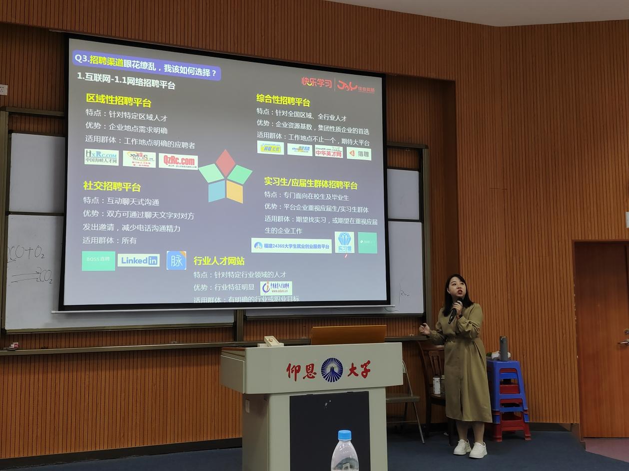 宣讲会上,郭颖经理首先就当代毕业生对就业的三大误区、如何提高竞争力、招聘渠道以及如何规划未来进行了详细分析和讲解。然后,刘懿萱老师以模拟教学的形式向毕业生展示了快乐学习的教育文化。