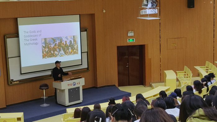 11月13日晚7时,第二场跨文化专题讲座由外教Raymond Romulo在新区和昌楼惟勤讲堂正式开讲,主题为“The Gods and Goddesses of the Greek Mythology”。讲座以AI生成的希腊诸神油画开场,通过短视频,介绍了希腊神话中诸神的神权,主要包括诸神之主和十二主神。Raymond总结了希腊神话的现实意义:古人通过这些神话故事解释自然现象,指导人们弃恶扬善,鼓励世人团结协作,自立互助,创造美好生活,而不是祈求诸神的怜悯。通过本讲座,学生对希腊神话体系有了初步认识,同时学会了辩证地看待希腊神话故事。