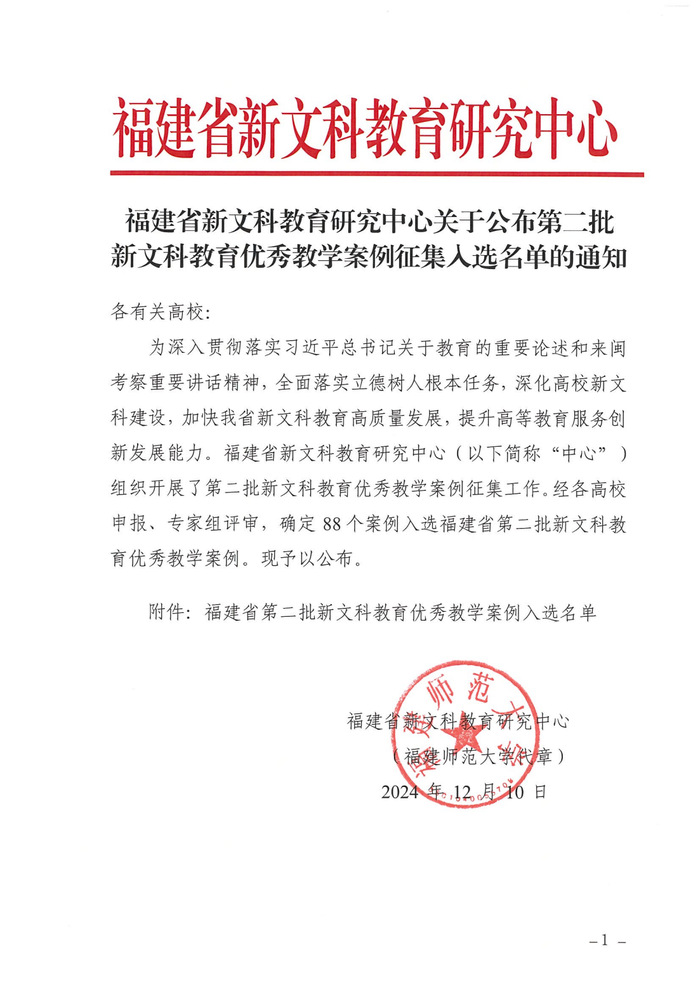 近日,福建省新文科教育研究中心公布了第二批新文科教育优秀教学案例的征集入选名单,我校开云kaiyun官方网站胡娟老师的“服务地方产业商务英语综合实践教学体系构建”教学案例脱颖而出,成为我校唯一一个入选此批名单的优秀教学案例。