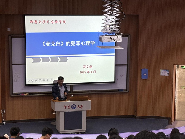 4 月 9 日下午,开云kaiyun官方网站特邀江苏科技大学吾文泉教授,在和昌楼博雅讲堂开展了主题为“《麦克白》犯罪心理学”的讲座。我院22 级及 23 级全体在校生到场学习,党总支书记刘冬利、副院长林燕媚、党总支副书记及部分教师也参加了此次讲座。