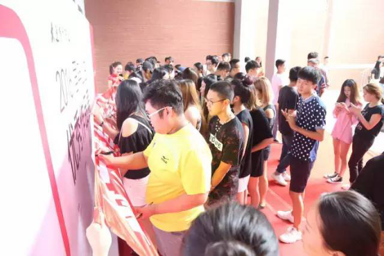 在场全体同学踊跃在条幅上签下自己的名字,表达了诚信考试的决心。